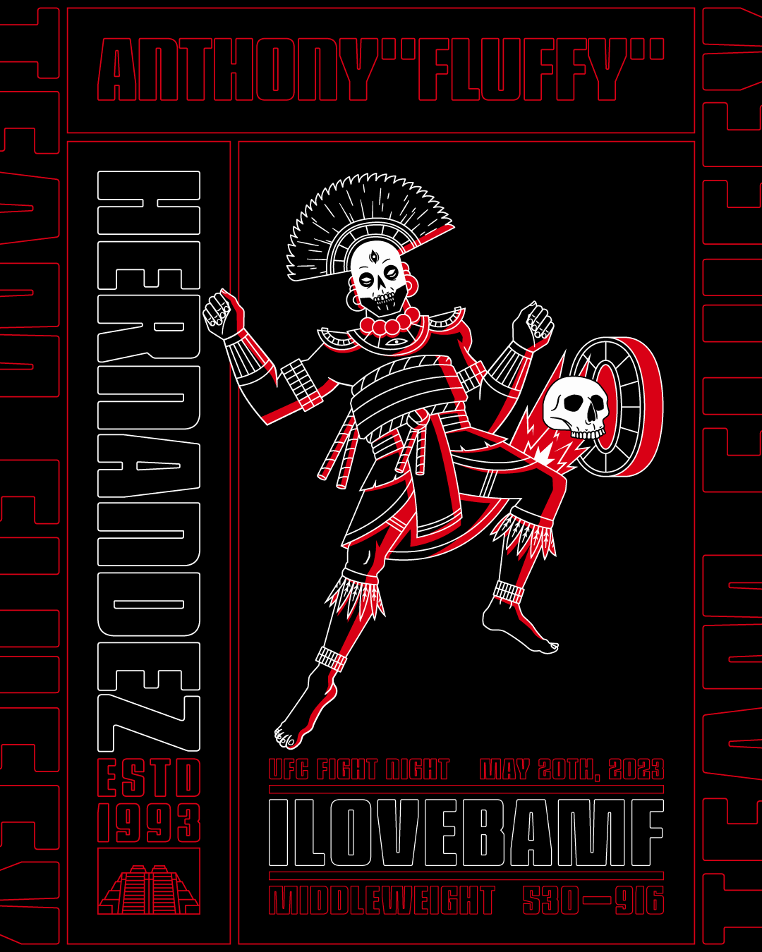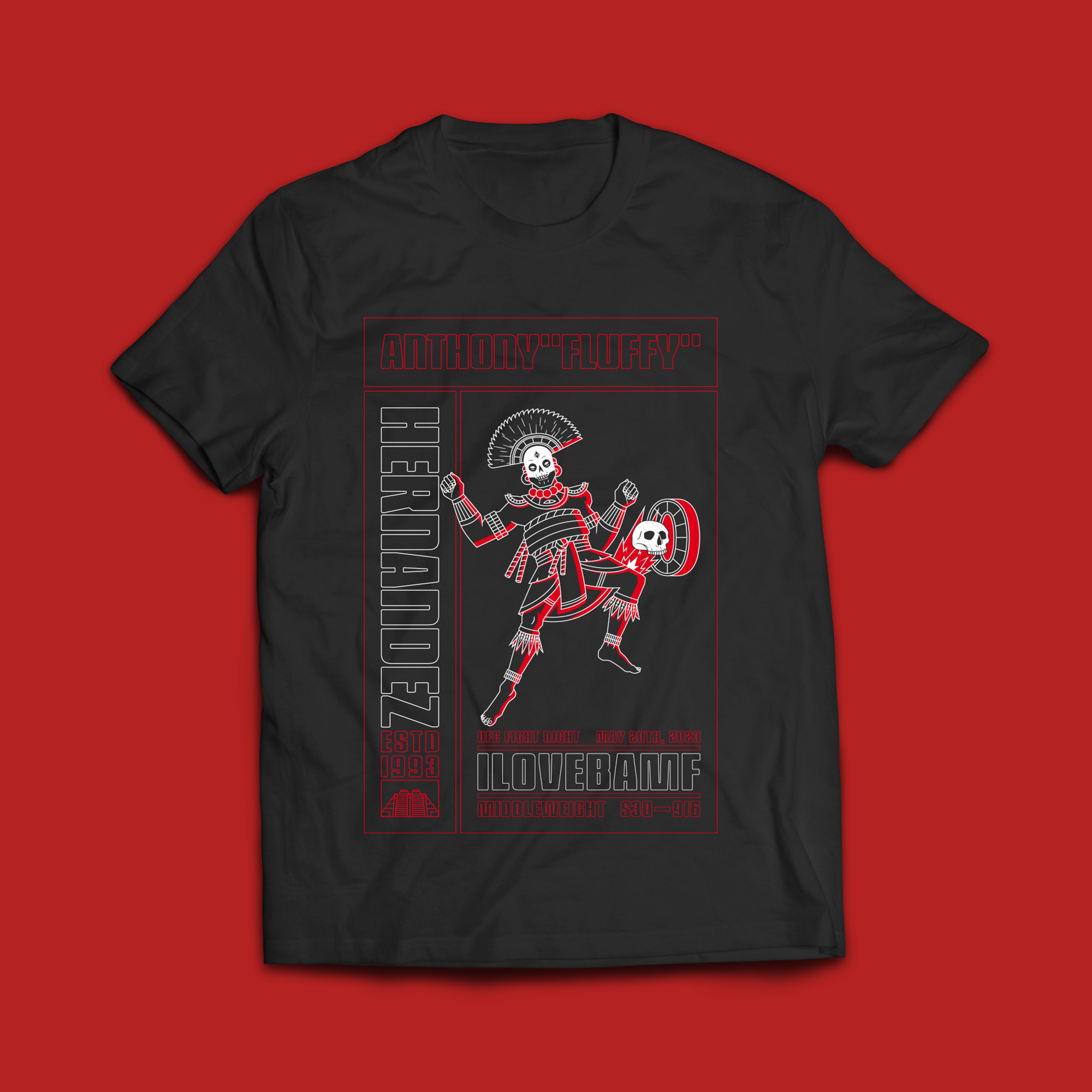 In 2023 I was commissioned by Anthony “Fluffy” Hernandez to make his UFC Fight Night tee! We went with an Aztec Warrior theme.